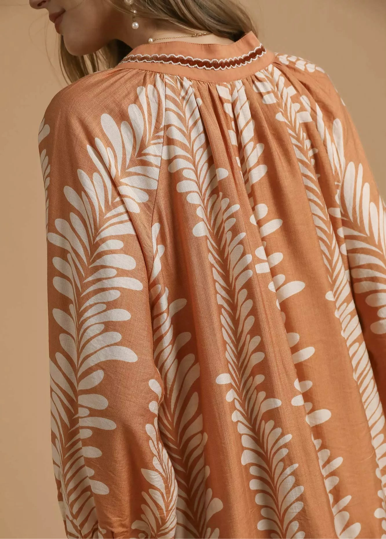 Umgee Leaf Print Notched Mini Babydoll Dress